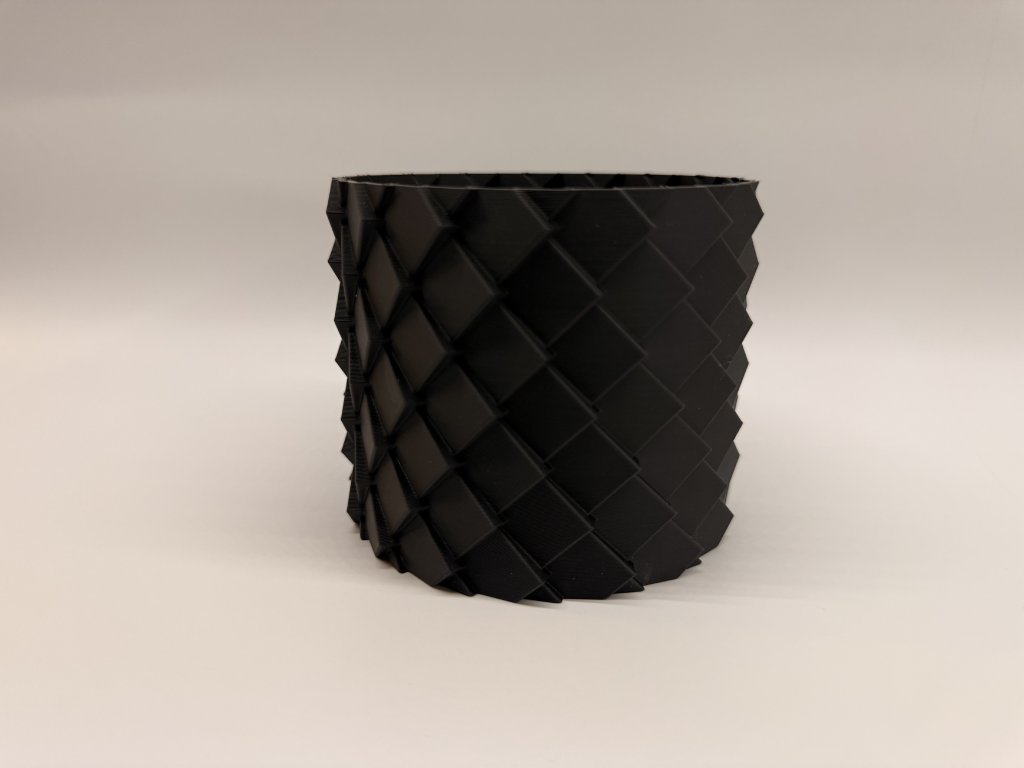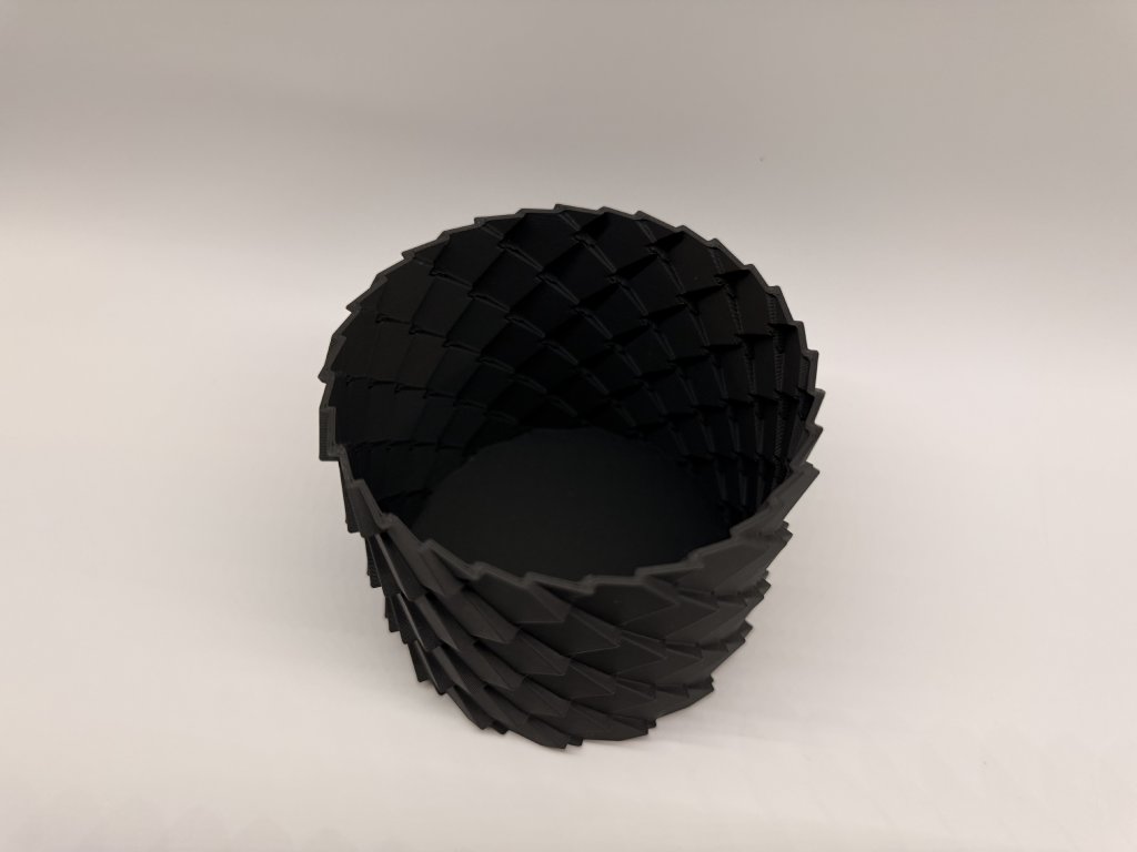 A pikkelymintás kaspó PLA anyagból, 3D nyomtatással készült, és markáns, geometrikus felületével azonnal magára vonja a figyelmet. A pikkelyszerű mintázat izgalmas fény–árnyék játékot hoz létre, így a kaspó önmagában is dekorációs elemként működik.