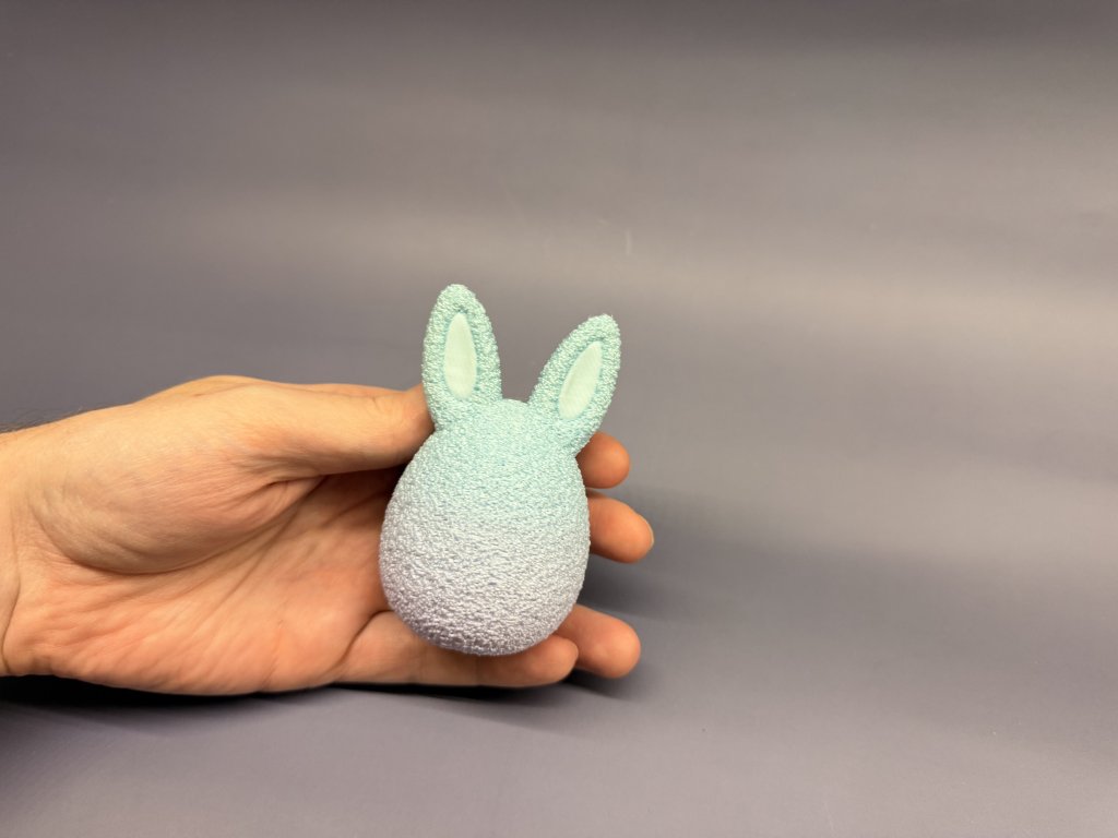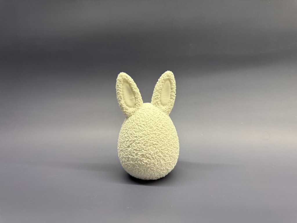 A dísz PLA anyagból, 3D nyomtatással készül. Bár kemény anyag, a felület kialakítása puha tapintású, plüssre emlékeztető hatást kelt, így vizuálisan meleg és barátságos megjelenést ad. Könnyű, mégis stabil dekoráció, amely jól mutat polcon, asztalon, ablakpárkányon vagy húsvéti összeállítás részeként.